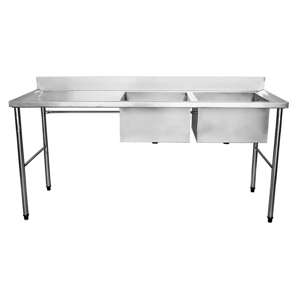 Bancada 1,8 metros de comprimento, produzidos em aço tipo 201. Duas cubas de 50cm a direita. Possui espelho de 10cm, impedindo que o líquido toque na parede. Produto de alta qualidade e resistência.