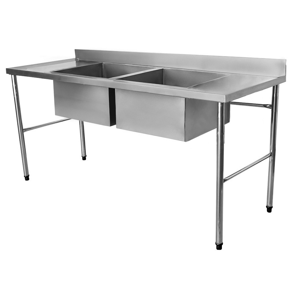 Bancada 1,8 metros de comprimento, produzidos em aço tipo 201. Duas cubas de 50cm Centrais. Possui espelho de 10cm, impedindo que o líquido toque na parede. Produto de alta qualidade e resistência.