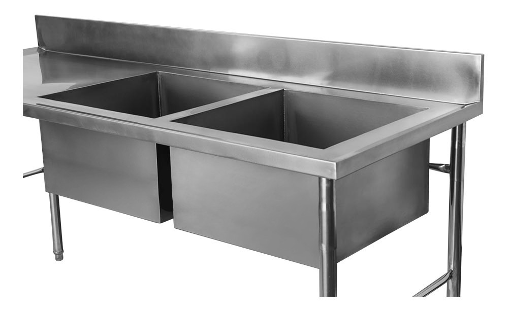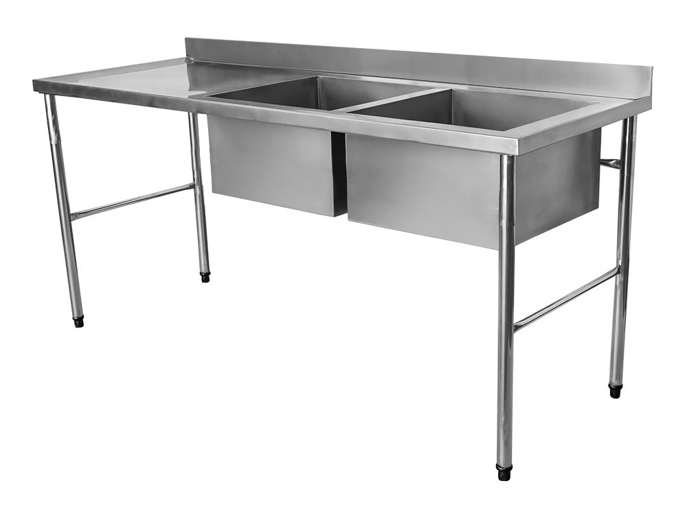 Bancada 1,6 metros de comprimento, produzidos em aço tipo 201. Duas cubas de 50cm a direita. Possui espelho de 10cm, impedindo que o líquido toque na parede. Produto de alta qualidade e resistência.