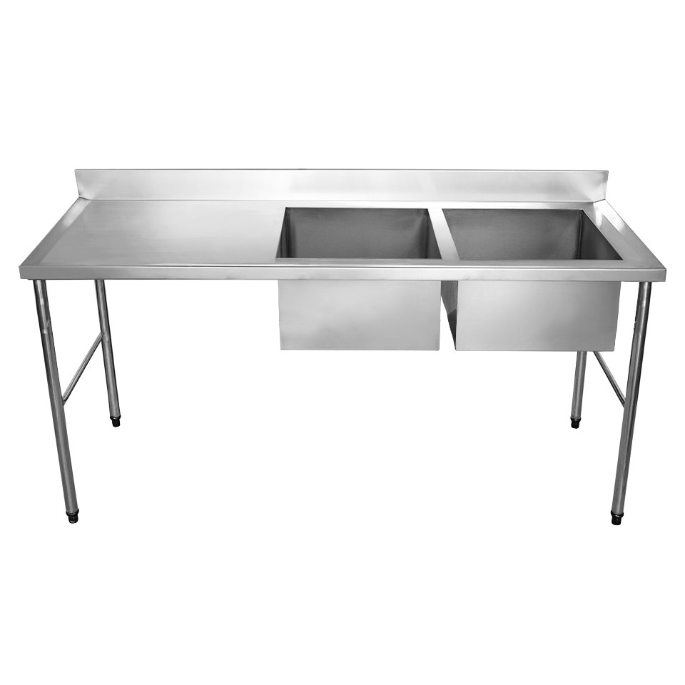 Bancada 1,8 metros de comprimento, produzidos em aço tipo 201. Duas cubas de 50cm a direita. Possui espelho de 10cm, impedindo que o líquido toque na parede. Produto de alta qualidade e resistência.