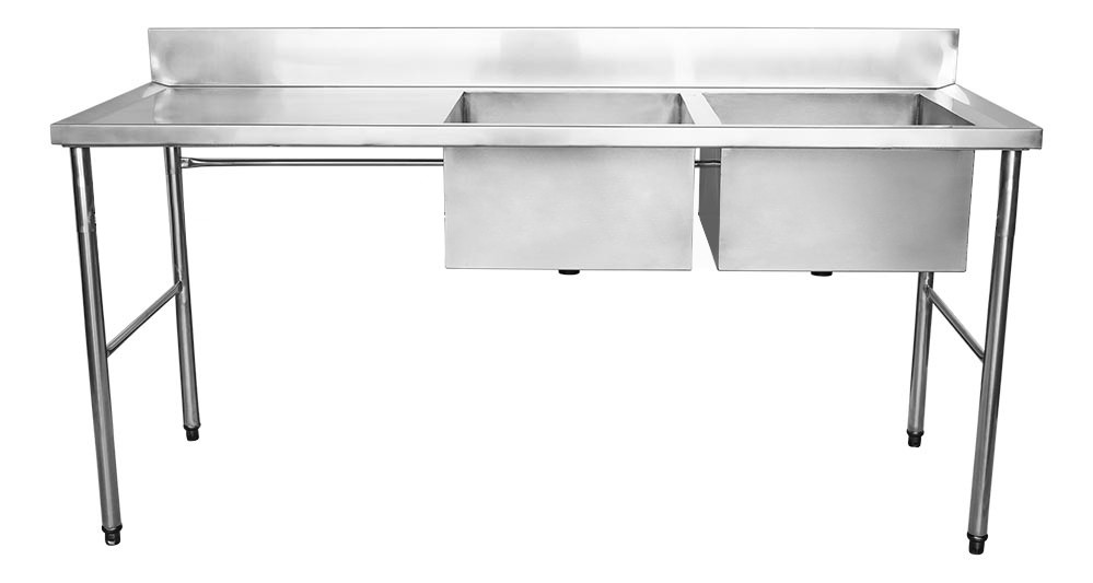 Bancada 1,9 metros de comprimento, produzidos em aço tipo 201. Duas cubas de 50cm a direita. Possui espelho de 10cm, impedindo que o líquido toque na parede. Produto de alta qualidade e resistência.