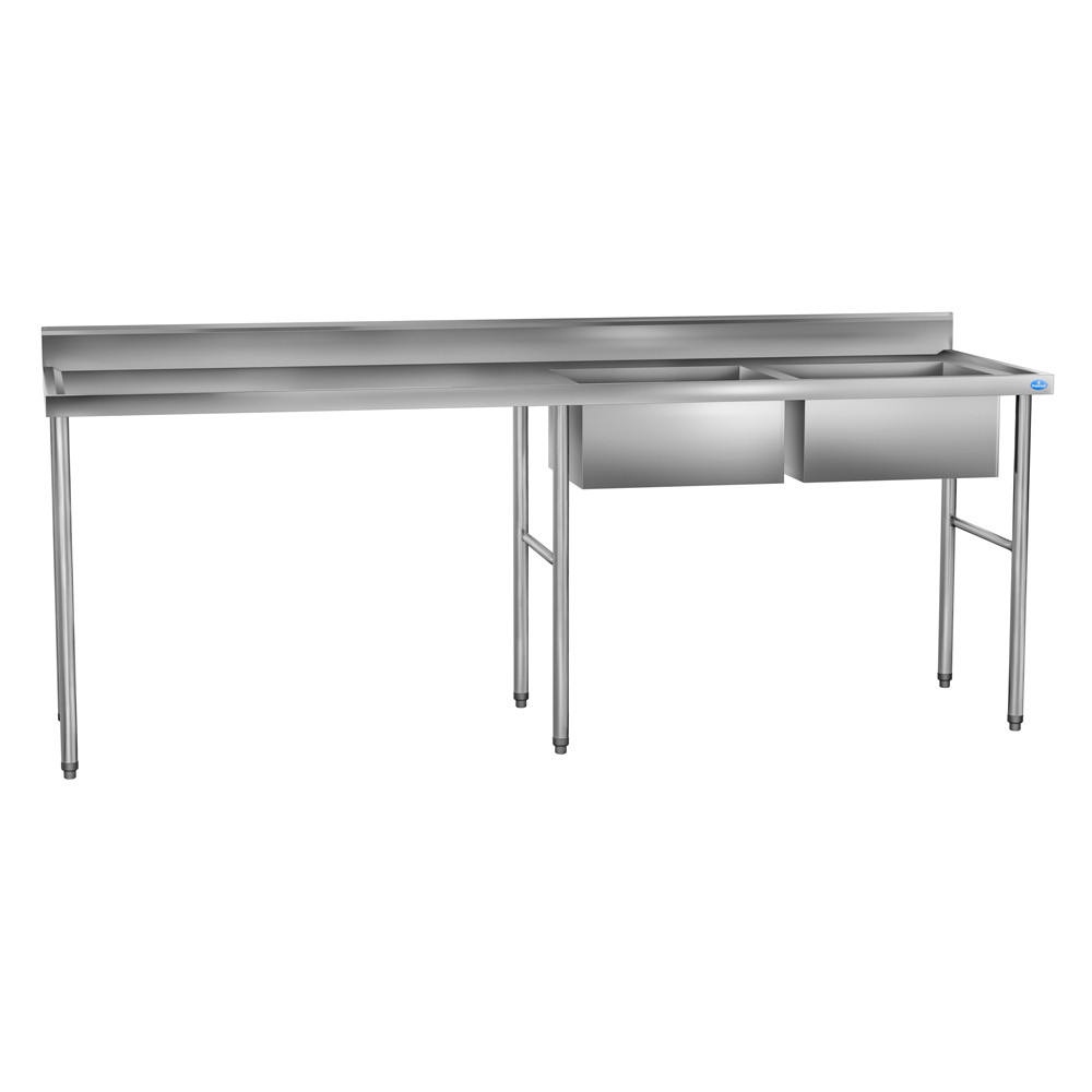 Bancada 2,4 metros de comprimento, produzidos em aço tipo 201. Duas cubas de 50cm a direita. Possui espelho de 10cm, impedindo que o líquido toque na parede. Produto de alta qualidade e resistência.