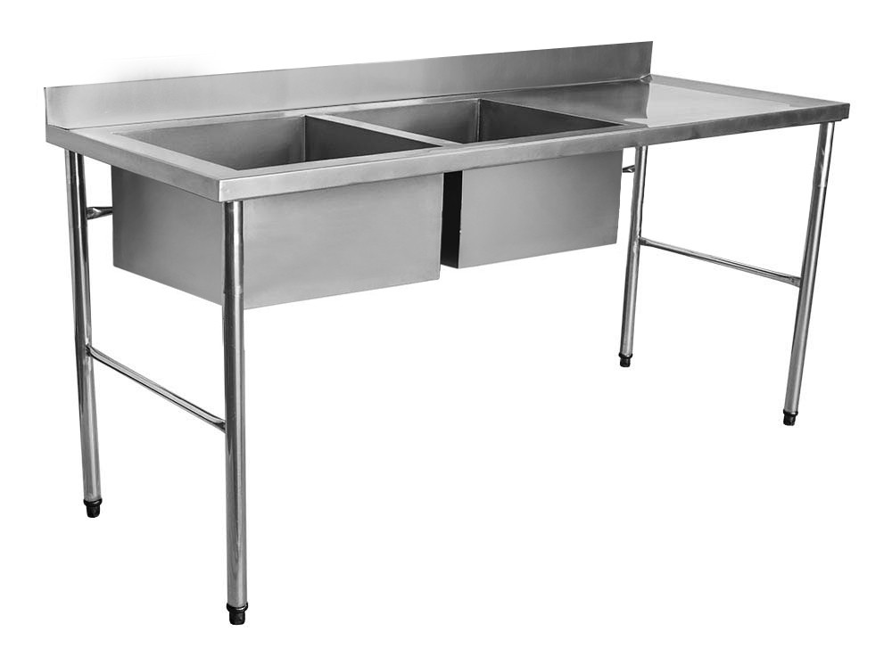 Bancada 1,6 metros de comprimento, produzidos em aço tipo 201. Duas cubas de 50cm a direita. Possui espelho de 10cm, impedindo que o líquido toque na parede. Produto de alta qualidade e resistência.