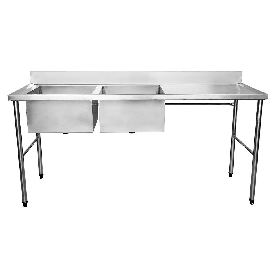 Bancada 1,8 metros de comprimento, produzidos em aço tipo 201. Duas cubas de 50cm a esquerda. Possui espelho de 10cm, impedindo que o líquido toque na parede. Produto de alta qualidade e resistência.