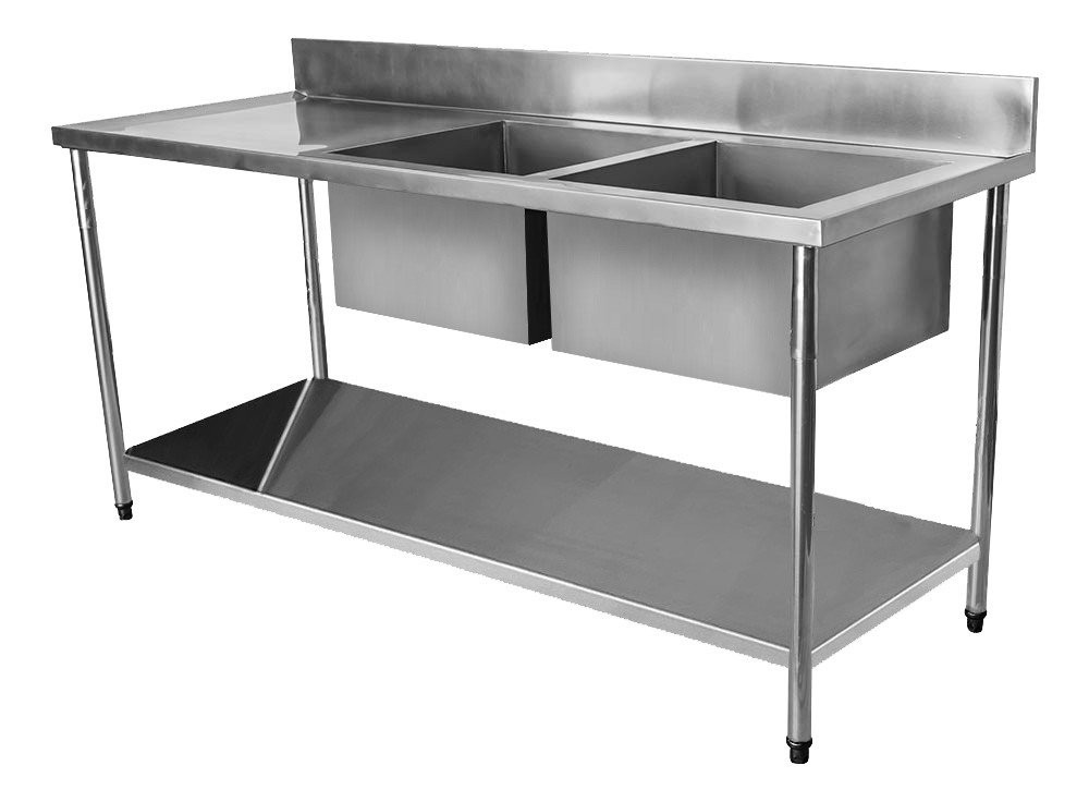 Bancada 1,6 metros de comprimento, produzidos em aço tipo 201. Duas cubas de 50cm a direita. Possui espelho de 10cm, impedindo que o líquido toque na parede. Produto de alta qualidade e resistência.