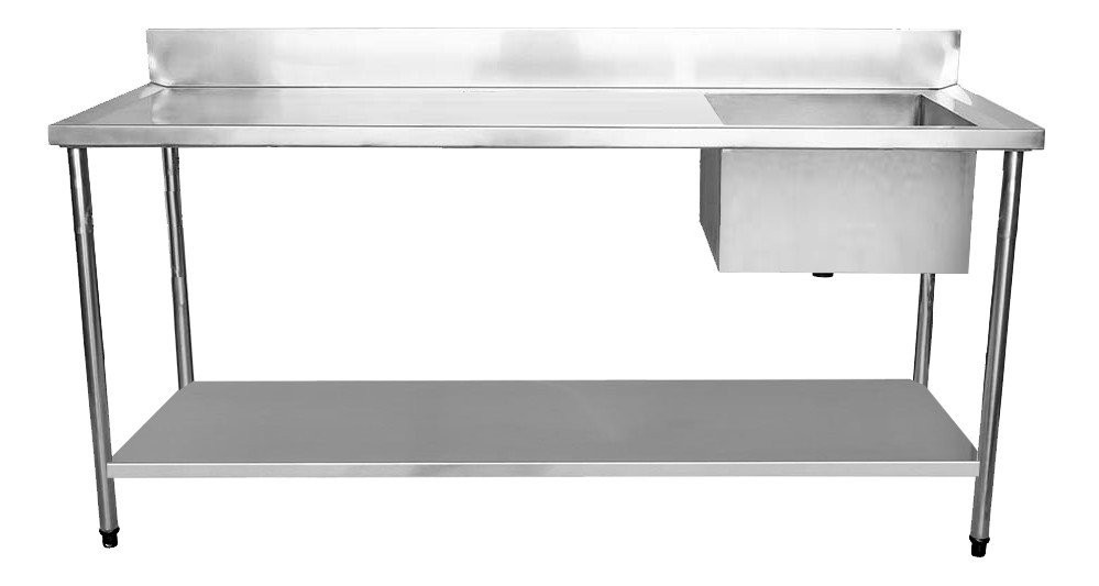 Bancada 1,9 metros de comprimento, produzidos em aço tipo 201. Uma cuba de 50cm a direita. Possui espelho de 10cm, impedindo que o líquido toque na parede. Produto de alta qualidade e resistência.