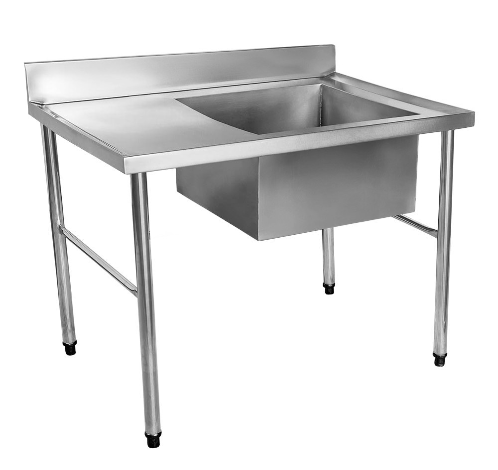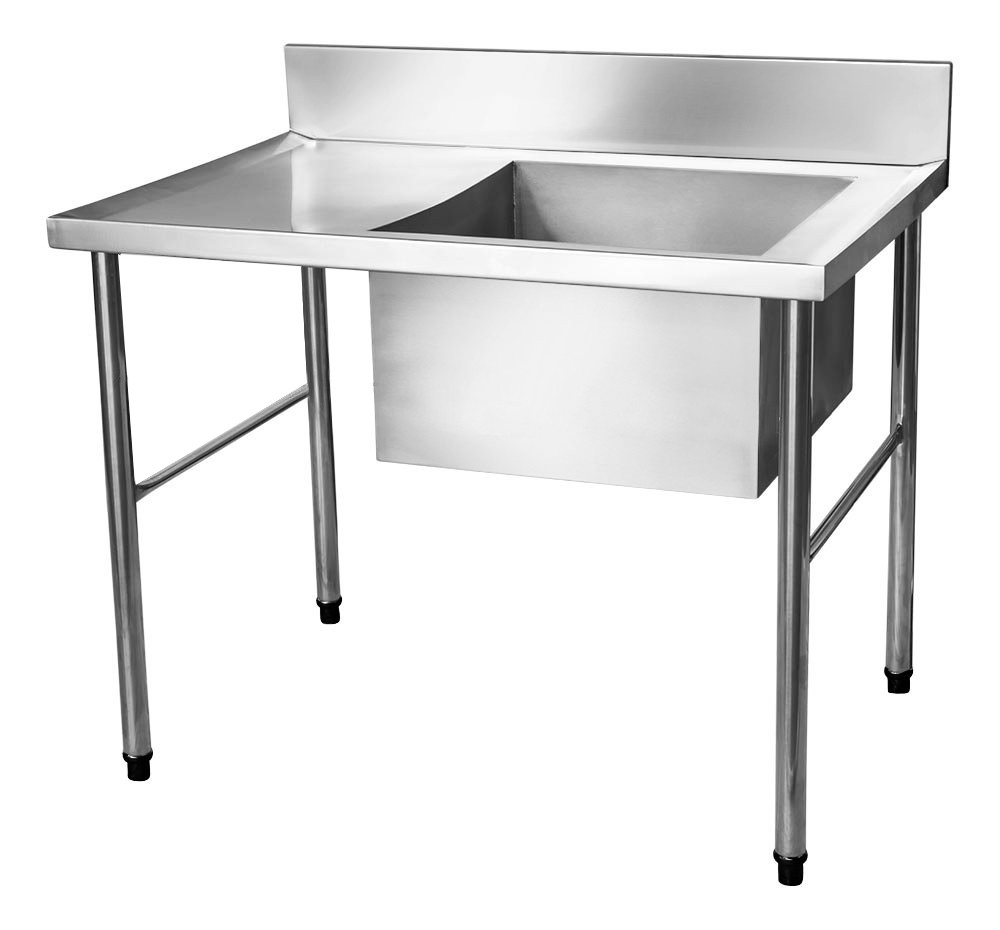 Mesa Pia em aço inox 201, com 1,9 metros de comprimento, uma cuba a direita e espelho frontão, garantindo qualidade e praticidade na manipulação dos alimentos. O frontão tem a finalidade de proteger a parede contra os respingos de água e demais líquidos. A capacidade total de carga da mesa é de 300kg.