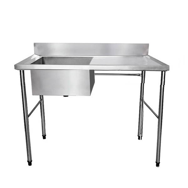 Mesa Pia em aço inox 201, com 1,2 metros de comprimento, uma cuba a esquerda e espelho frontão, garantindo qualidade e praticidade na manipulação dos alimentos. O frontão tem a finalidade de proteger a parede contra os respingos de água e demais líquidos. A capacidade total de carga da mesa é de 300kg.