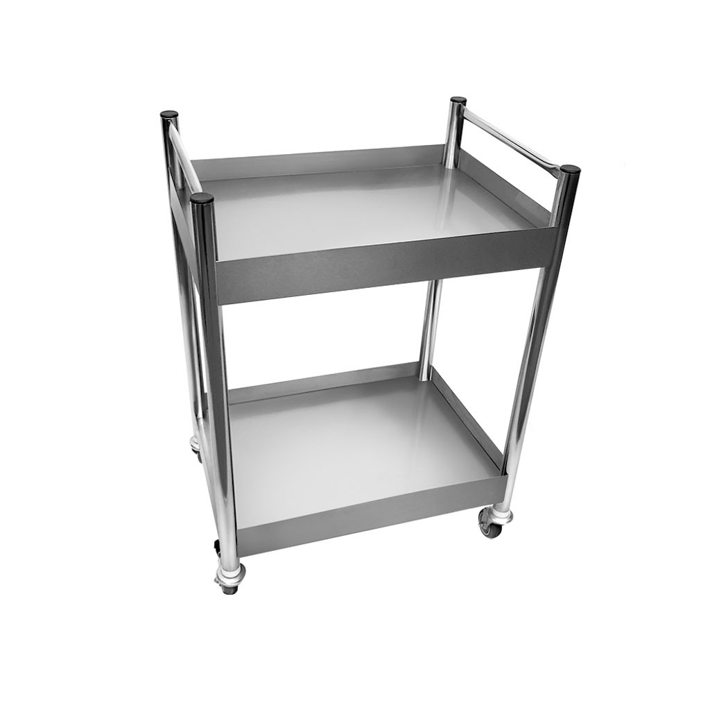 Mesa auxiliar com dimensões de 70x50x95cm , fabricada totalmente em aço inox do tipo 201, contém duas prateleiras com varanda, dois puxadores e rodízios. Tem capacidade total de peso de 80kg , sendo 40kg na prateleira superior e 40kg na prateleira inferior.