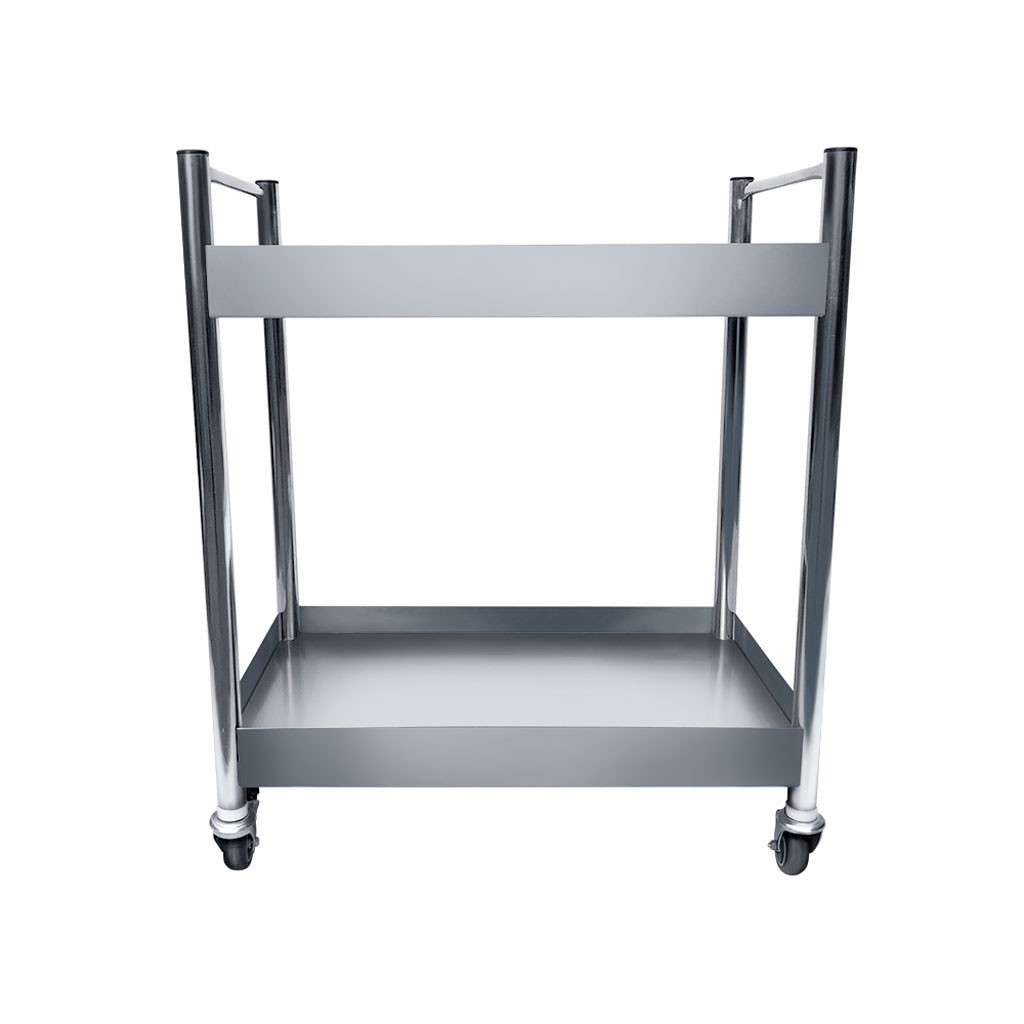 Mesa auxiliar medindo 80x50x95cm , com fabricação 100% em aço inox do tipo 201, possui 2 prateleiras com varanda, 2 puxadores e rodízios. Pode suportar até 80kg de carga, sendo 40kg na prateleira de cima e 40kg na prateleira de baixo.