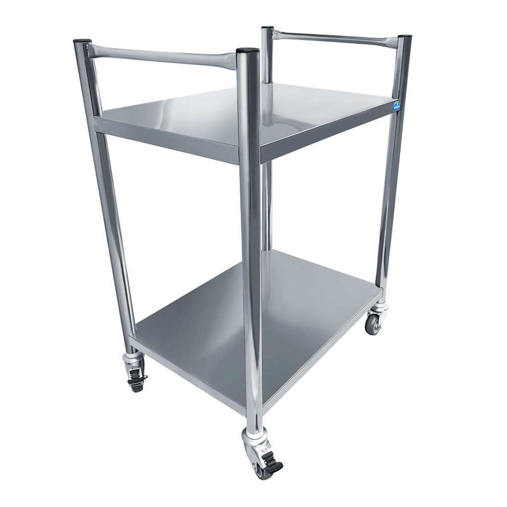 Mesa auxiliar 70x50x95cm produzida totalmente em aço inox tipo 201, com 2 puxadores, 2 prateleiras e rodízios. Pode suportar até 80kg de carga, sendo 40kg na prateleira de cima e 40kg na prateleira de baixo.