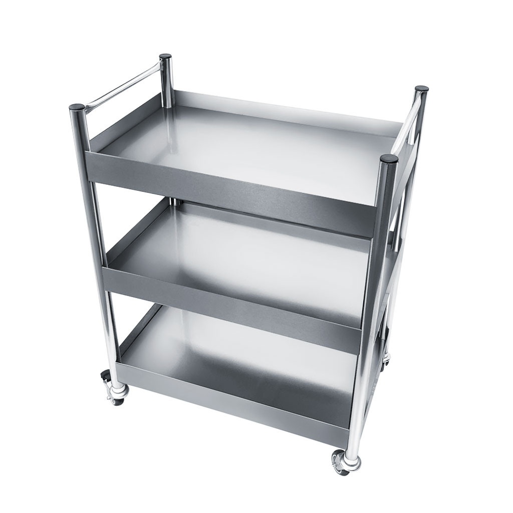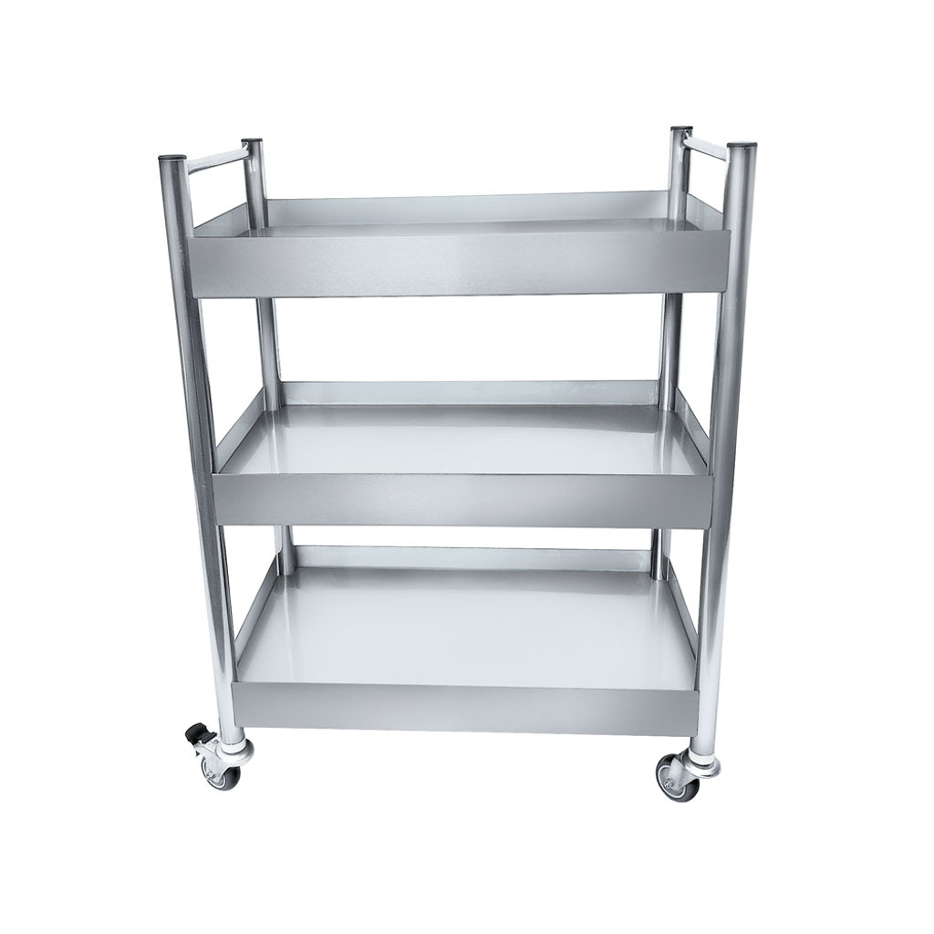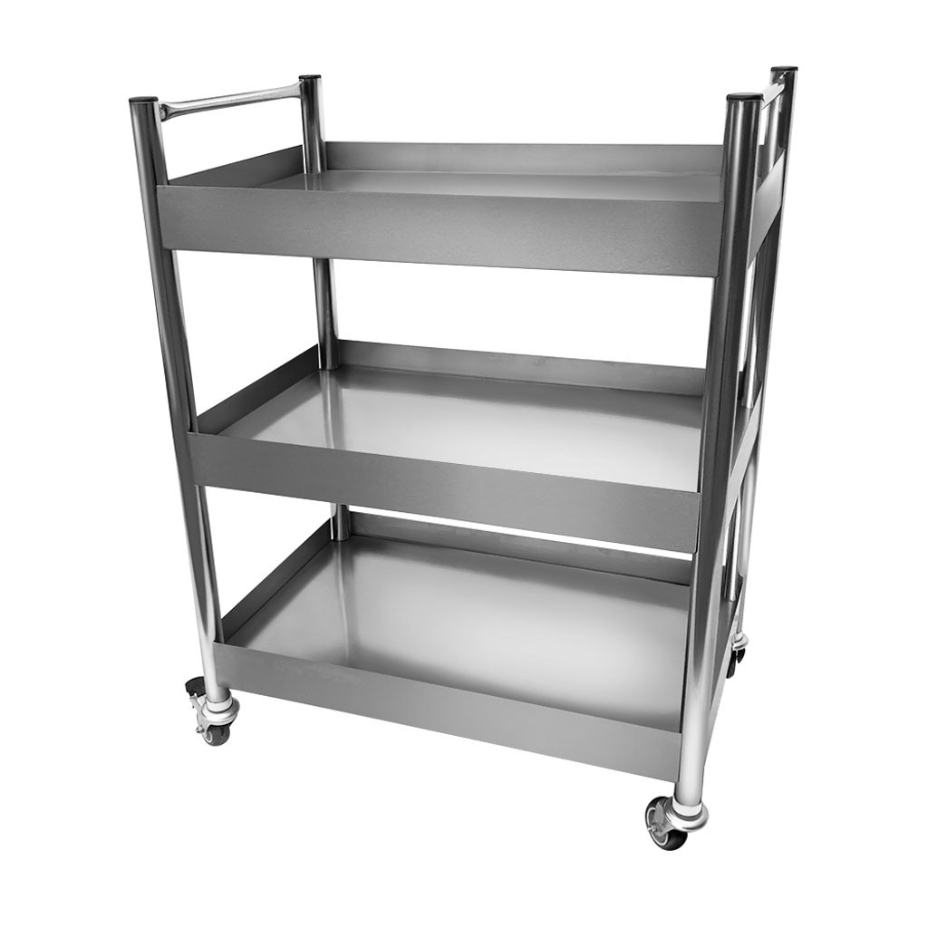 Mesa auxiliar com tamanho de 80x50x105cm produzida 100% em aço inoxidável tipo 201, possui 3 prateleiras com varanda, 2 puxadores e rodízios. Sua capacidade total de peso é de 120kg , sendo 40kg distribuídos para cada prateleira.