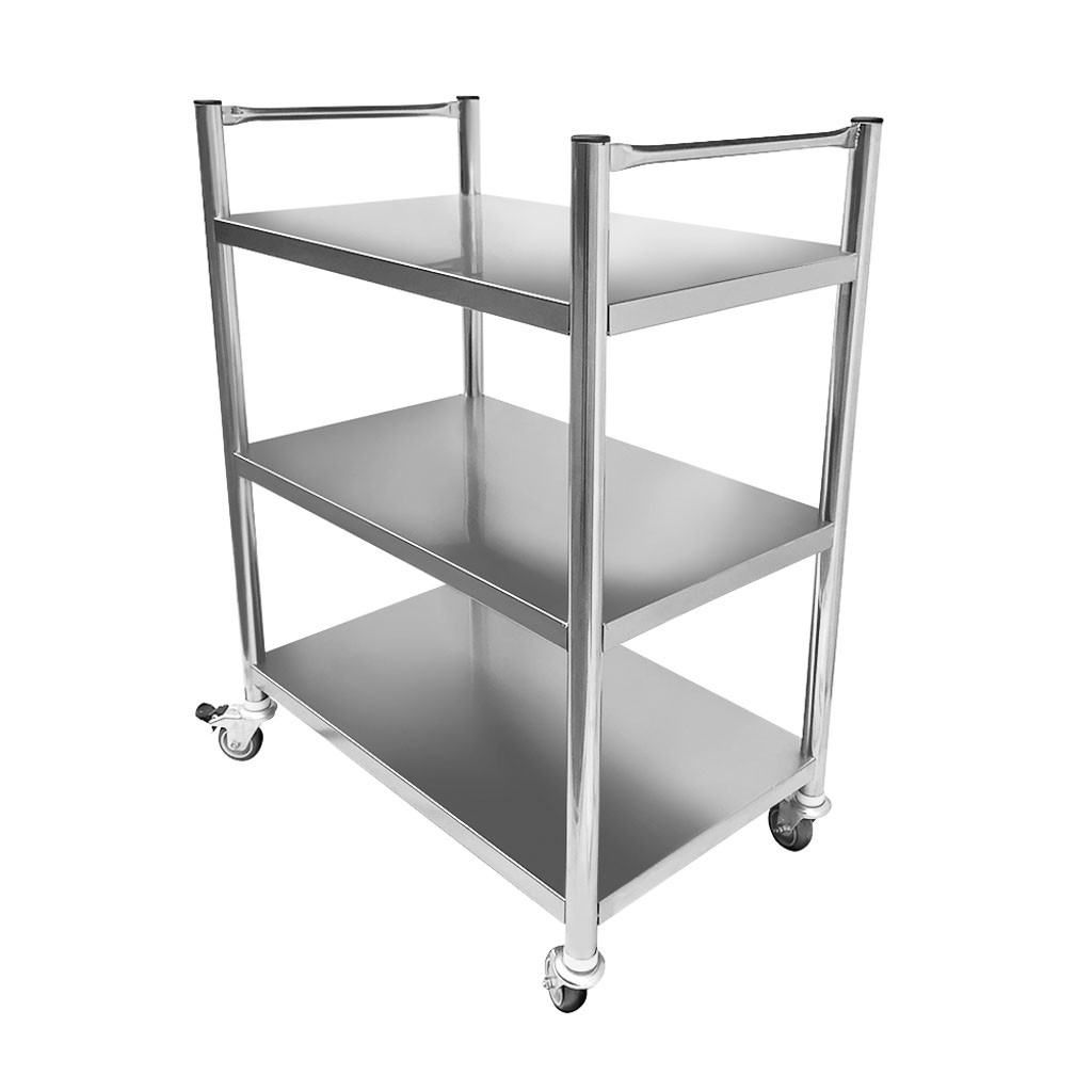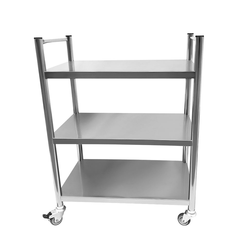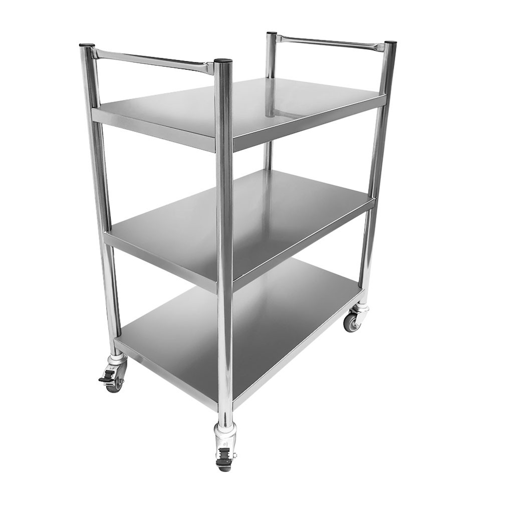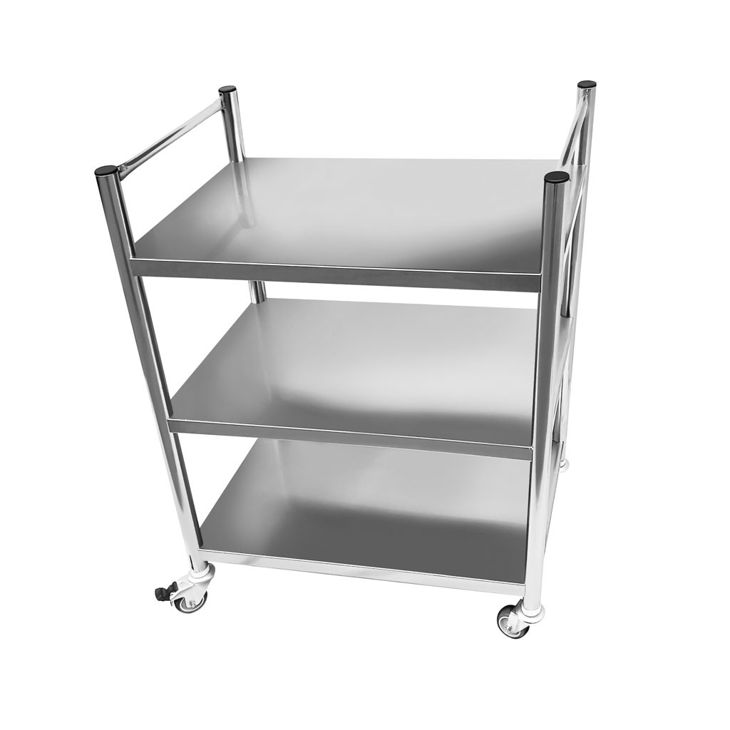 Mesa auxiliar com dimensões de 80x50x105cm , produzida 100% em aço inoxidável do tipo 201, possui três prateleiras, dois puxadores e rodízios. Suporta até 120kg de carga, sendo 40kg na prateleira superior , 40kg na prateleira central e 40kg na prateleira inferior.