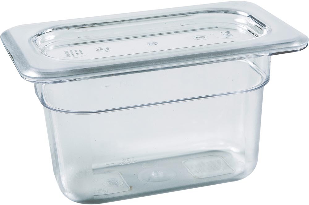 Cuba gastronômica com tampa GN 1/9 x 100mm, produzida totalmente em Policarbonato. Material de alta qualidade. Compatível com Rechauds e especialmente desenvolvida para a utilização em Buffets Self Service, Carrinhos Térmicos, Restaurantes e Refeitórios em geral.