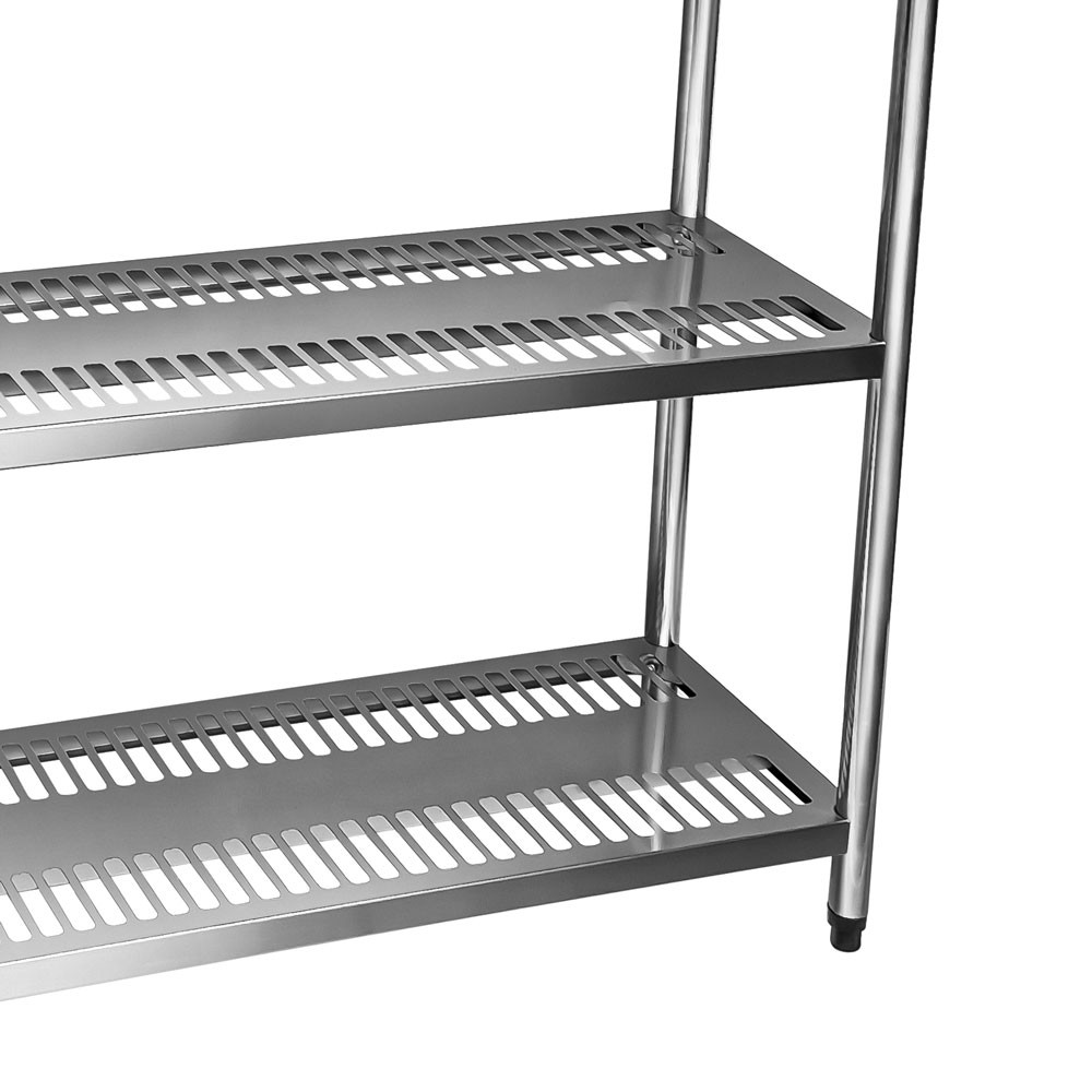Perfeita para cozinhas industriais, laboratórios, clínicas e estoques comerciais, esta Estante em Aço Inox 201 com 4 prateleiras gradeadas de 80x50x150cm oferece organização eficiente e ventilação ideal para utensílios, insumos e equipamentos. Seu design com prateleiras vazadas permite melhor circulação de ar, evitando acúmulo de umidade e contribuindo para a conservação dos itens armazenados.