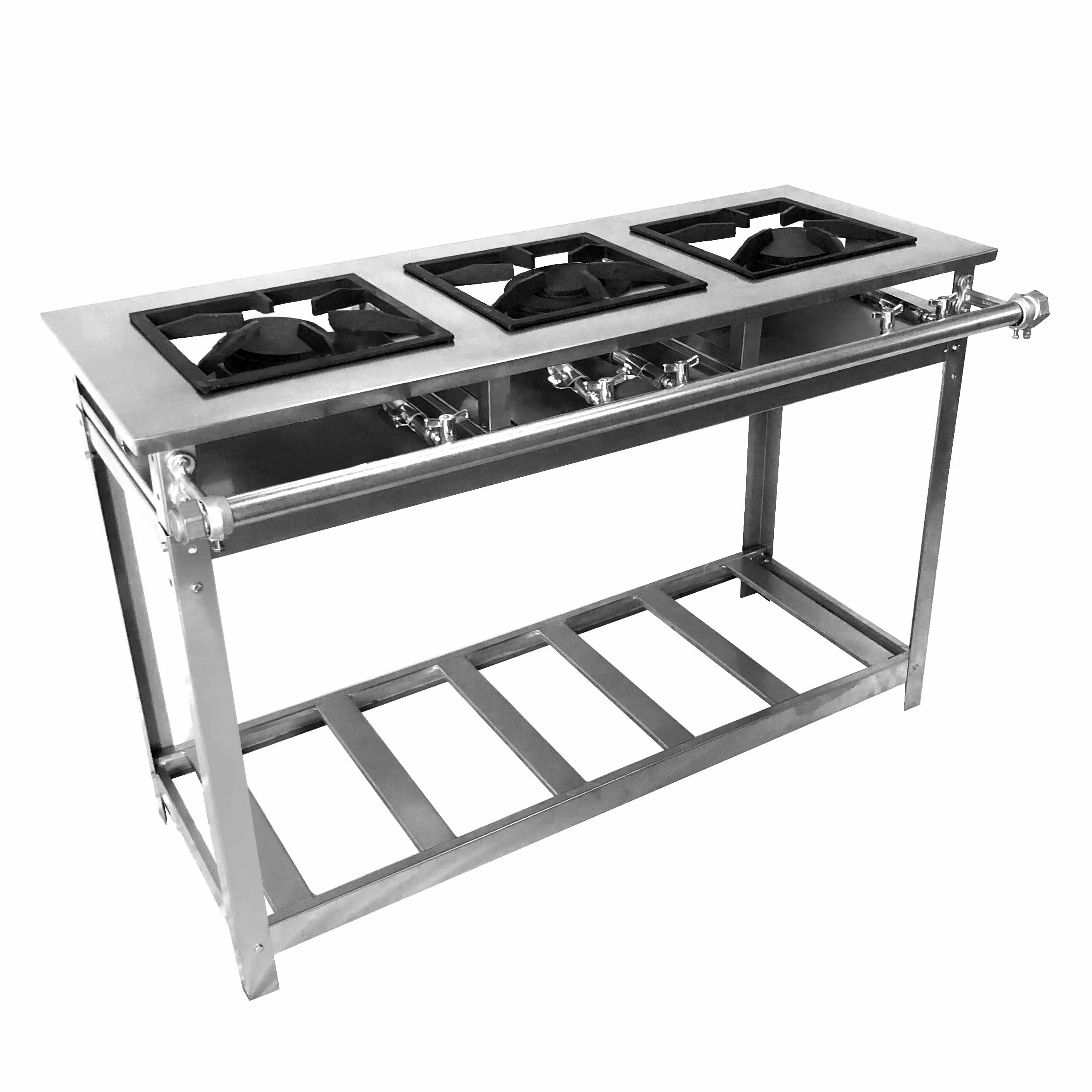 Produzido em Aço Inoxidável tipo 201 de alta qualidade e resistência, o Fogão de 3 bocas, sendo 2 simples e 1 dupla, com grelha e bocas em ferro fundido, proporciona um alto desempenho na preparação de alimentos, tanto em pequenas quantidades, quanto em grandes.
