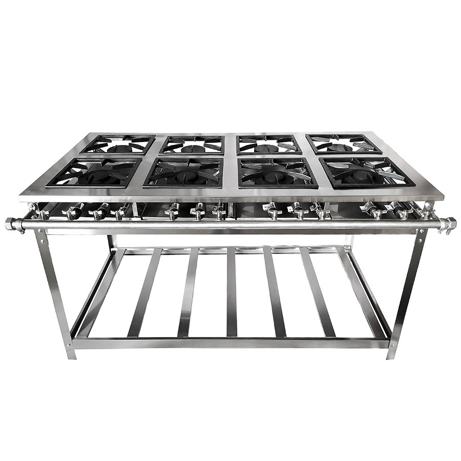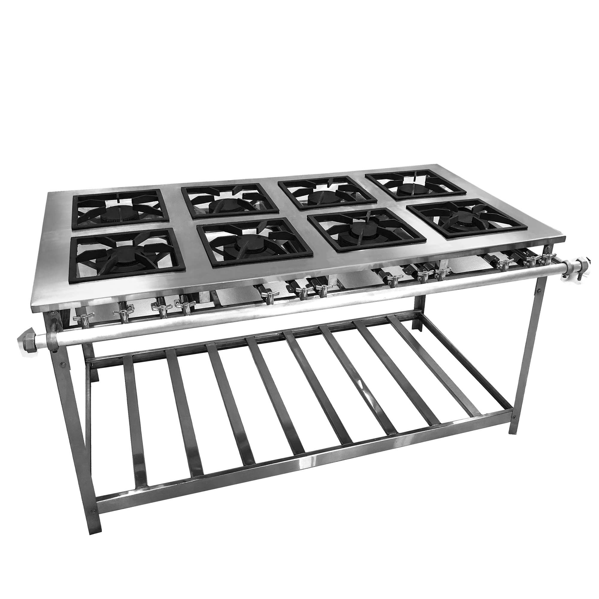 Produzido em Aço Inoxidável tipo 201 de alta qualidade e resistência, o Fogão de 8 bocas, sendo 4 simples e 4 duplas, com grelha e bocas em ferro fundido, proporciona um alto desempenho na preparação de alimentos, tanto em pequenas quantidades, quanto em grandes.