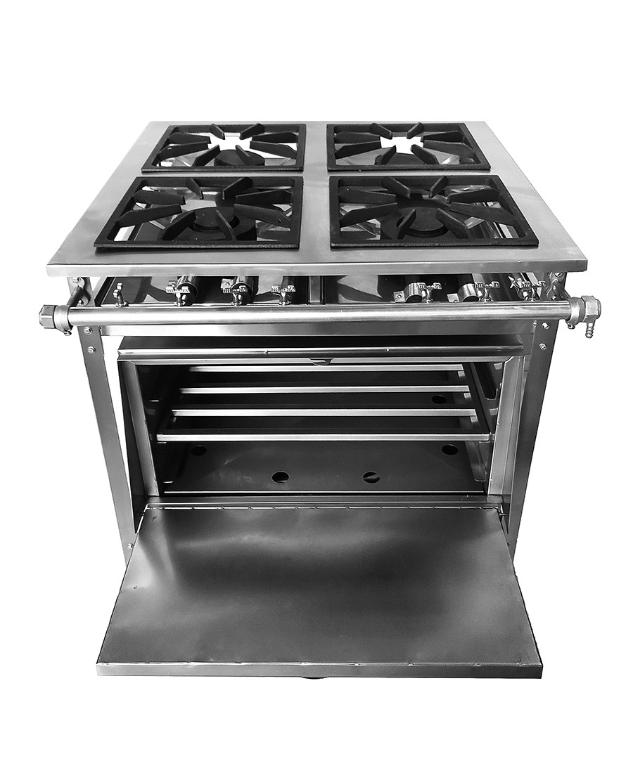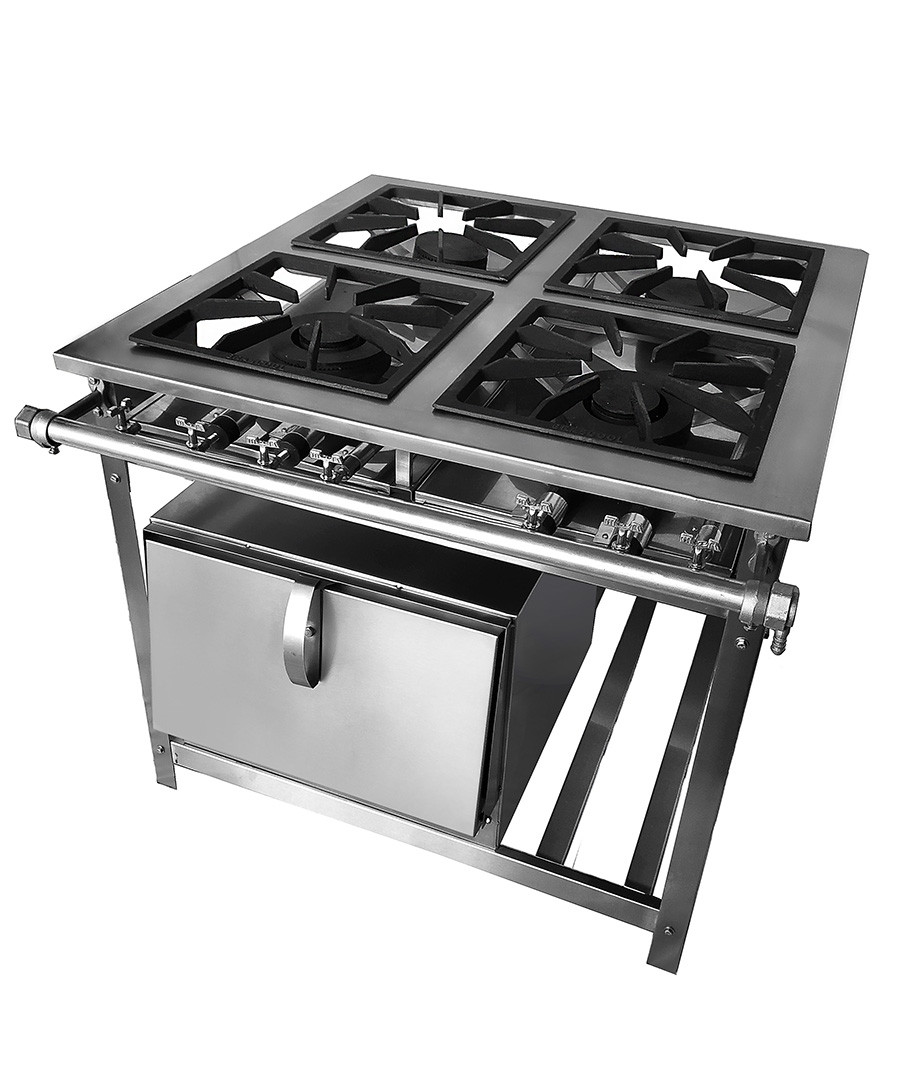 Produzidos em Aço Inoxidável tipo 201 de alta qualidade e resistência, o Fogão de 4 bocas (2 simples e 2 duplas), com grelhas e bocas em ferro fundido, juntamente com o Forno 80 Litros, proporcionam um alto desempenho na preparação de alimentos, tanto em pequenas quantidades, quanto em grandes.
