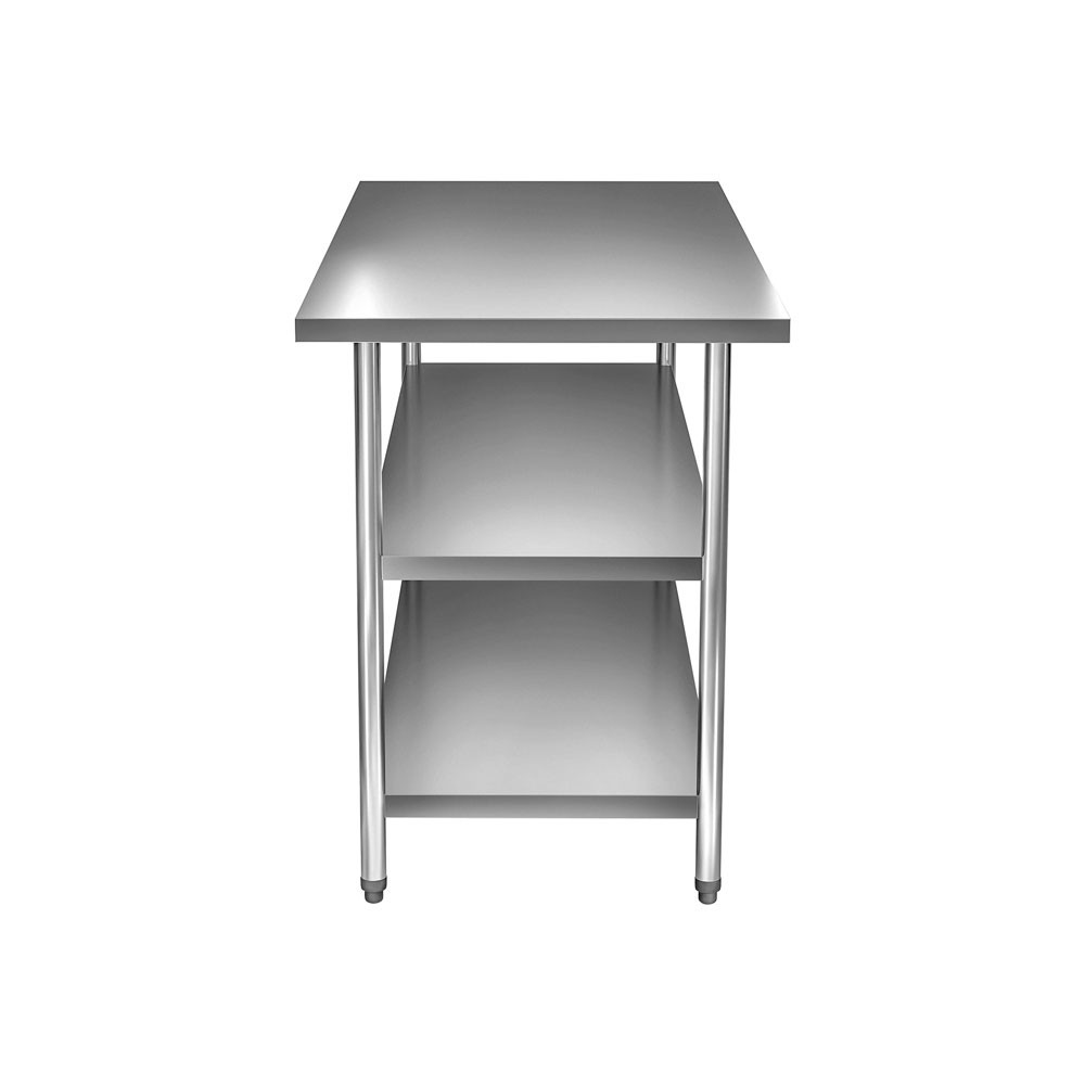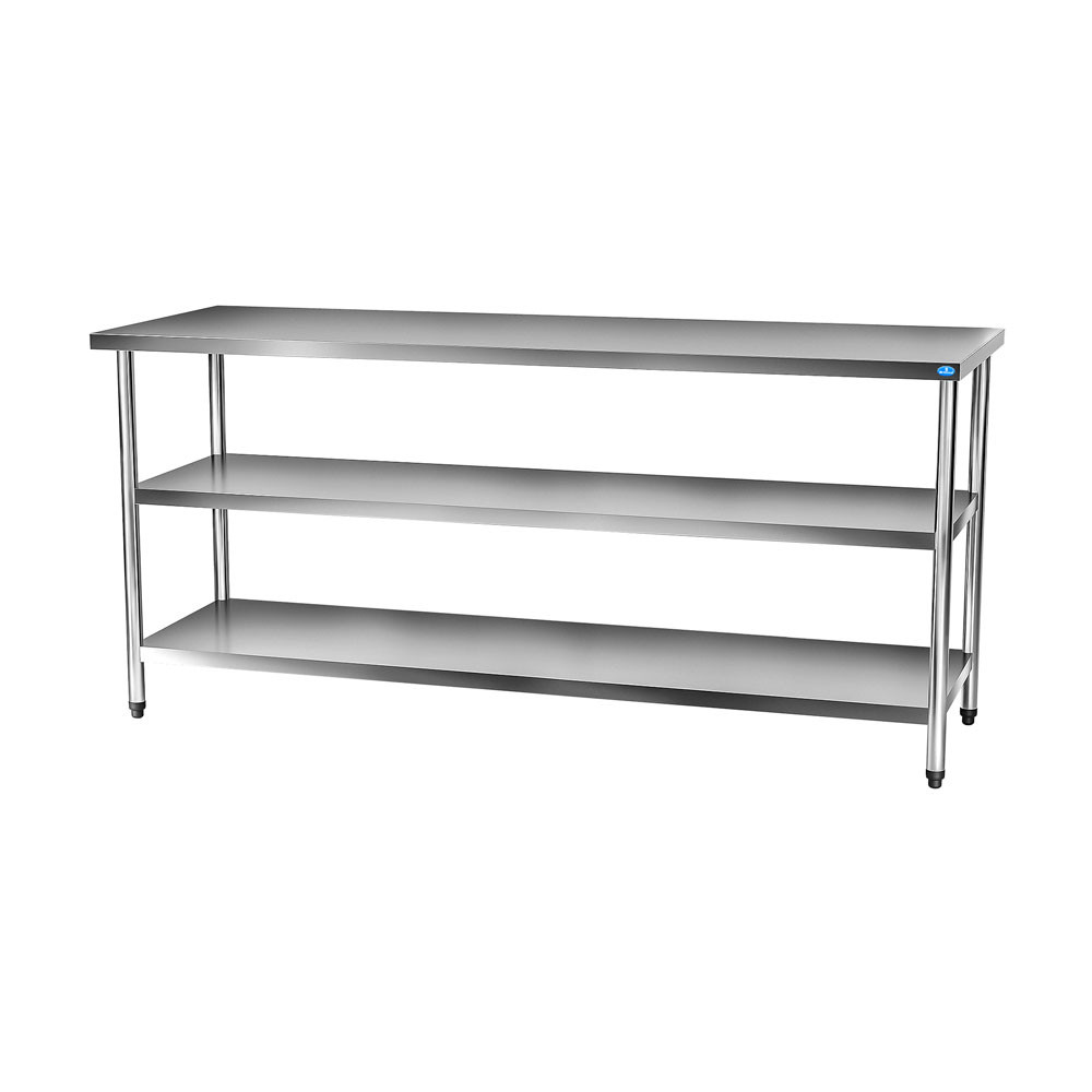 Mesa de aço inox 201, possui 1,9m de comprimento e 70cm de largura, garantindo qualidade e agilidade na manipulação dos alimentos. Suporta até 500kg de carga, sendo 300kg na tampa superior e 100kg em cada um dos planos inferiores.