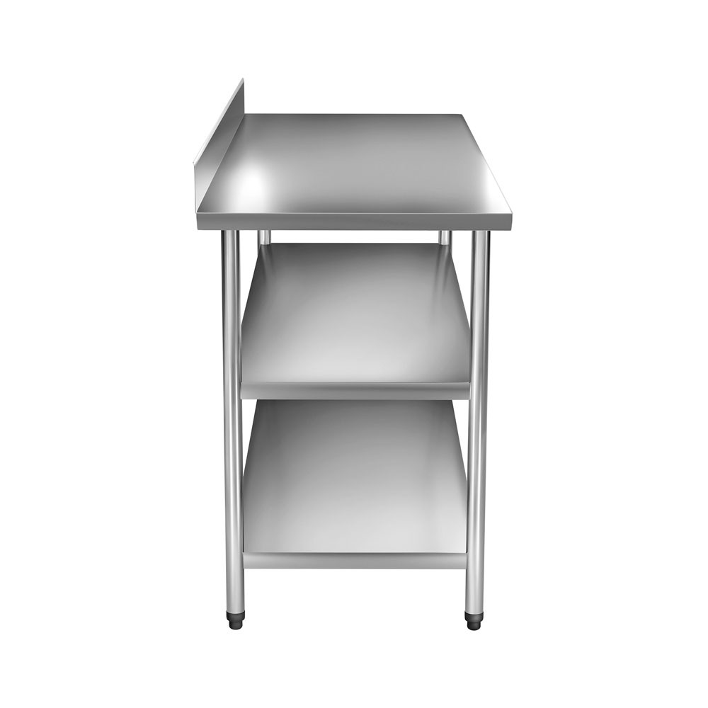 Mesa de aço inox Tipo 201, com 1,9m de comprimento, 60cm de largura e espelho frontão na parte acima da bancada, especificamente para proteger a parede contra os respingos de água e demais líquidos. Possui dois paneleiros inferiores que servem para armazenamento de materiais de uso constante. A mesa tem capacidade para suportar até 500kg de carga, sendo 300kg na tampa superior e 100kg em cada um dos paneleiros inferiores.
