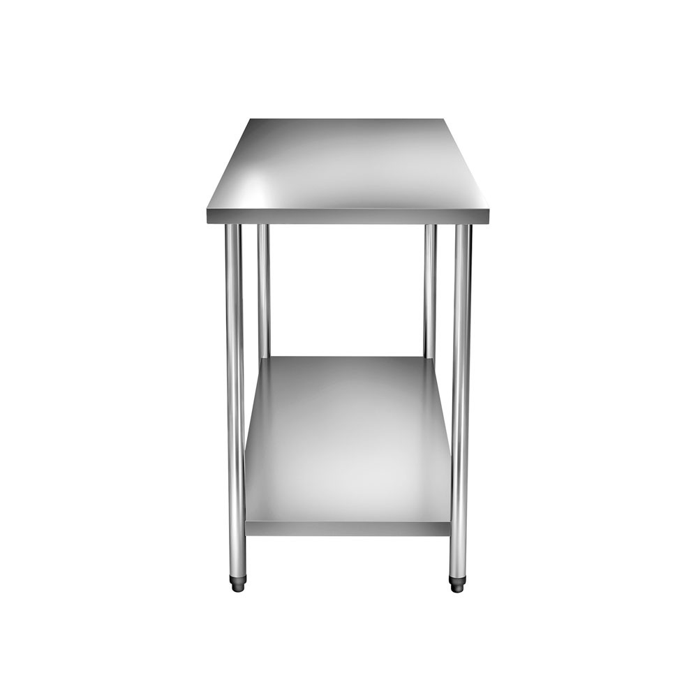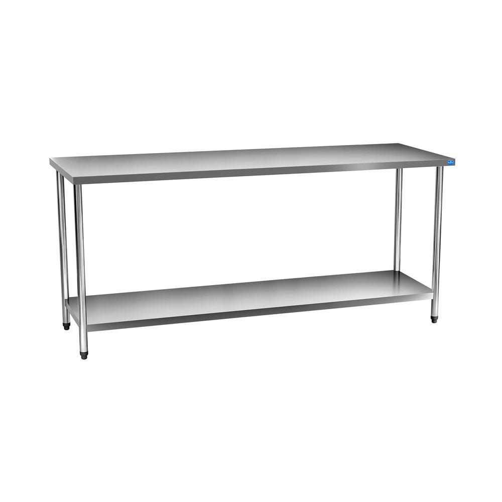 Mesa de 1,9m de comprimento, e 60cm de largura, feito totalmente em aço inox 201, garantindo qualidade na manipulação dos alimentos. Suporta até 400kg de carga, sendo 300kg na tampa superior e 100kg na tampa inferior.