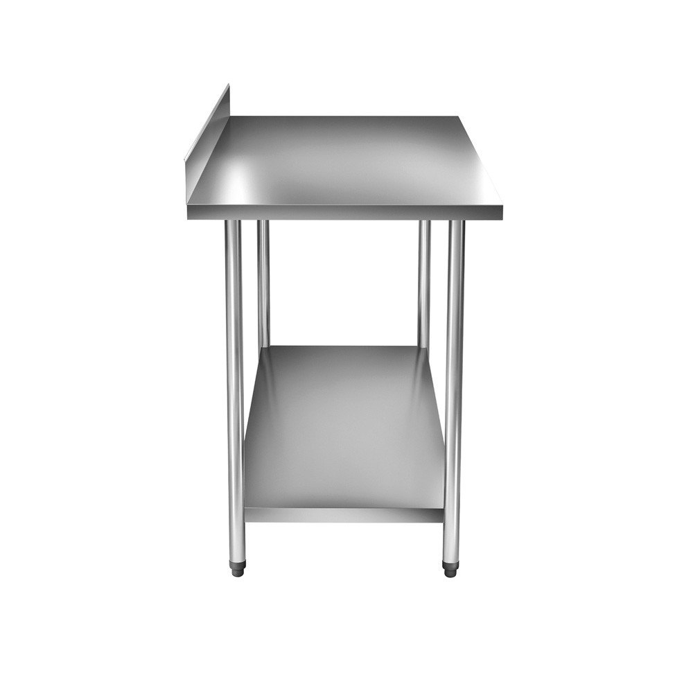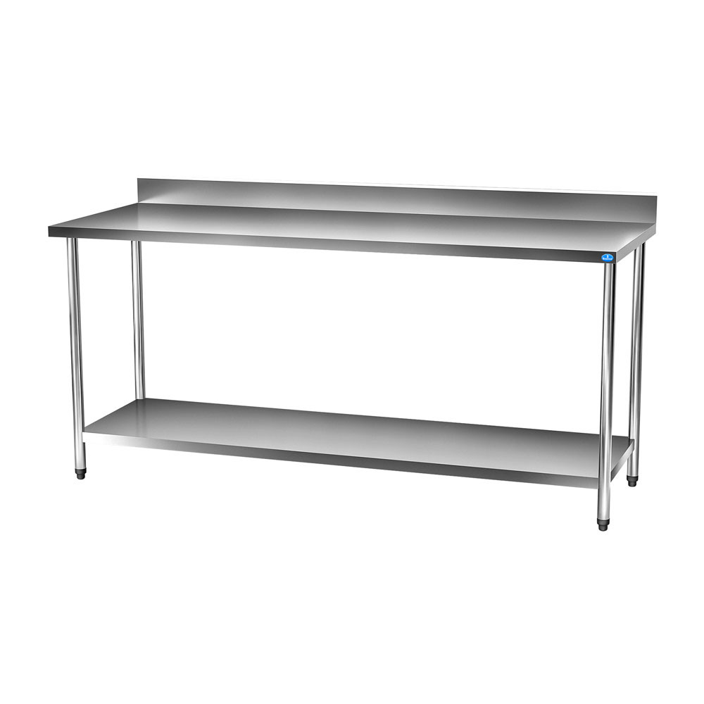 Mesa Industrial totalmente produzida com aço tipo 201, com 1,9m de comprimento, 70cm de largura e espelho frontão, garante qualidade na manipulação dos alimentos. O frontão é aquela faixa fixa acima da bancada. Sua função é de proteger a parede contra os respingos de água e demais líquidos. Suporta até 400kg de carga, sendo 300kg na tampa superior e 100kg na tampa inferior.