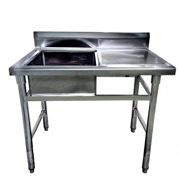 Mesa Bancada de 1,1 metros com cuba de 50x50x28cm, produzida totalmente em Aço Inoxidável AISI 201 de alta qualidade e resistência. Opção ideal para a utilização como pia ou lavatório em cozinhas industriais e comerciais, proporcionando higiene e durabilidade.