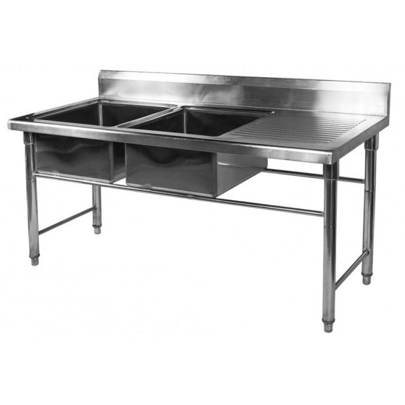 Mesa Bancada em Aço Inoxidável de 1,7 metros com 2 cubas de 50x50x25cm, produzida totalmente em Aço Inoxidável AISI 201 de alta qualidade e resistência. Opção excelente para a utilização como pia ou lavatório em cozinhas industriais e comerciais, proporcionando higiene e durabilidade.