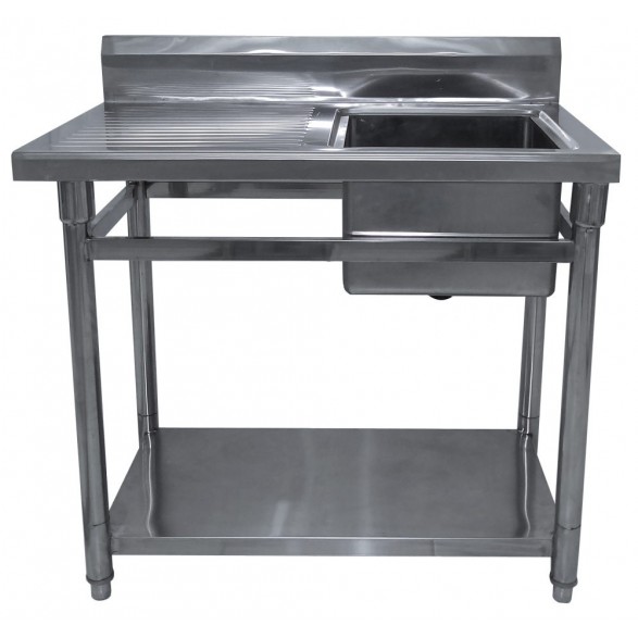 Mesa Bancada de 1,05 metros com cuba de 40x40x28cm, produzida totalmente em Aço Inoxidável AISI 201 de alta qualidade e resistência. Opção ideal para a utilização como pia ou lavatório em cozinhas industriais e comerciais, proporcionando higiene e durabilidade.