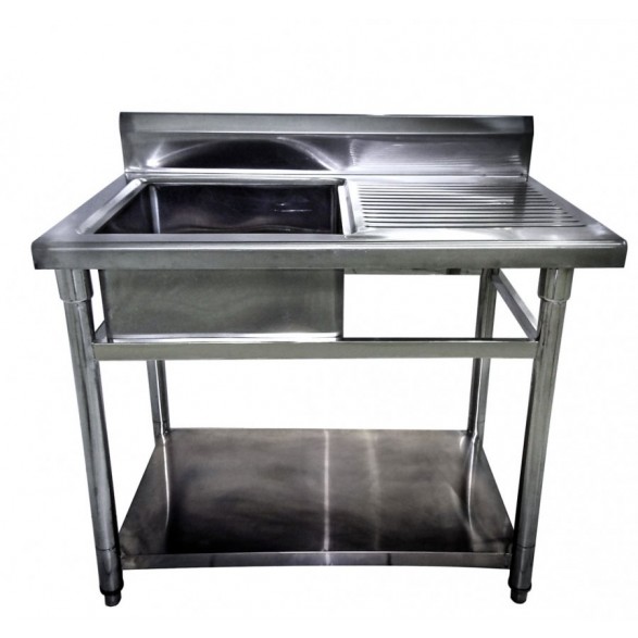 Mesa Bancada de 1,1 metros com cuba de 50x50x28cm, produzida totalmente em Aço Inoxidável AISI 201 de alta qualidade e resistência. Opção ideal para a utilização como pia ou lavatório em cozinhas industriais e comerciais, proporcionando higiene e durabilidade.