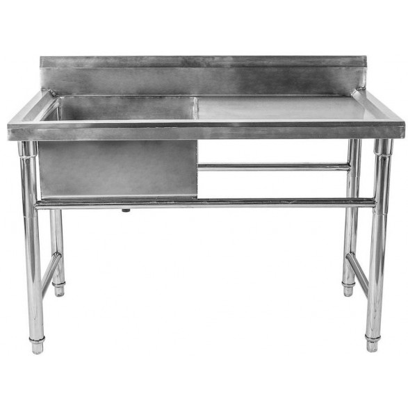 Mesa Bancada de 1,1 metros com cuba de 50x50x28cm, produzida totalmente em Aço Inoxidável AISI 201 de alta qualidade e resistência. Opção ideal para a utilização como pia ou lavatório em cozinhas industriais e comerciais, proporcionando higiene e durabilidade.