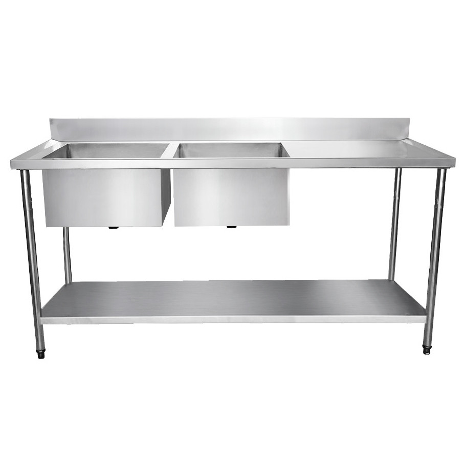 Mesa/Pia de Aço inox com 1,8 metros de comprimento sem paneleiro, produzida em Aço Inoxidável tipo 201 com duas cubas 50x40x25cm feita em Aço Inoxidável 304 posicionada ao lado de escolha. Produto usado em cozinhas industriais de estabelecimentos comerciais como em restaurantes, bares, lanchonetes, hotéis, casa de festas entre outros.