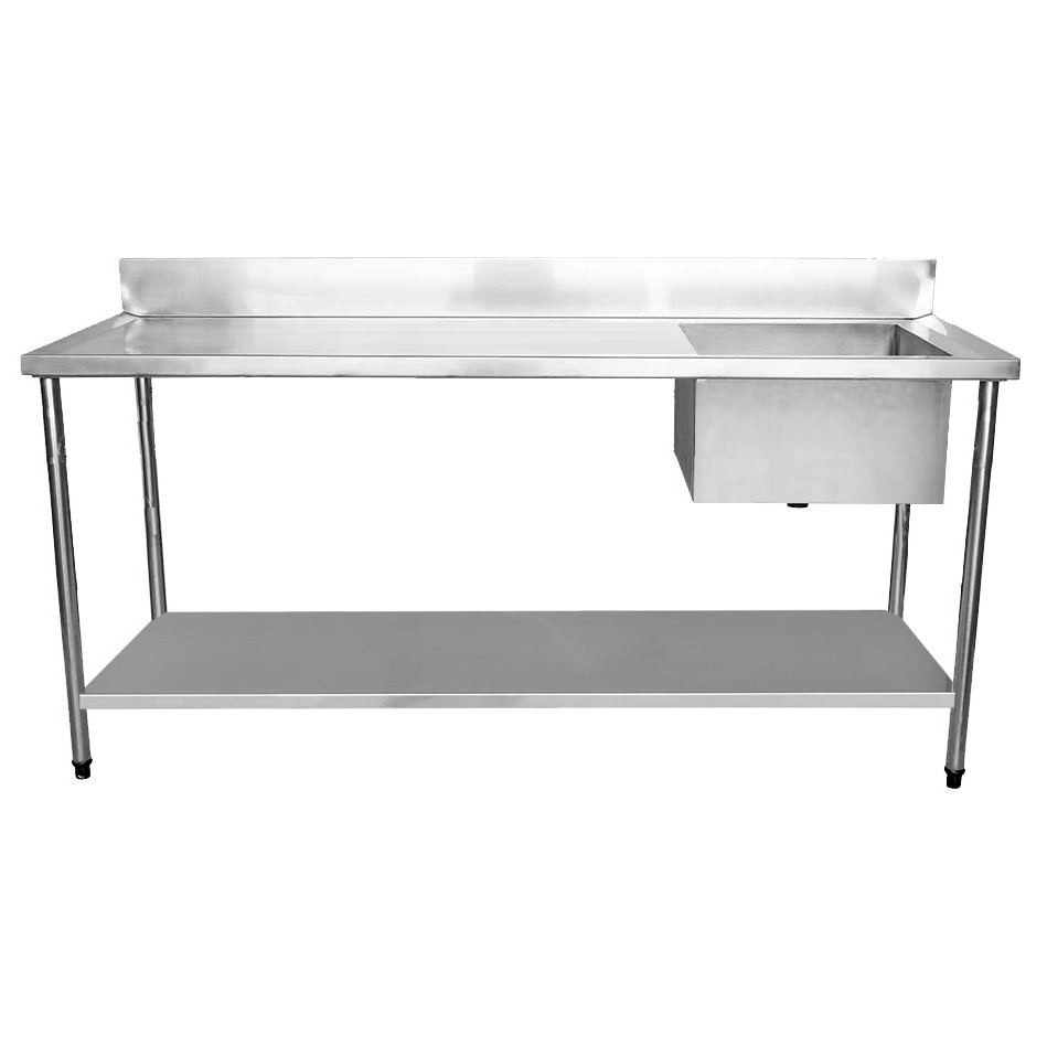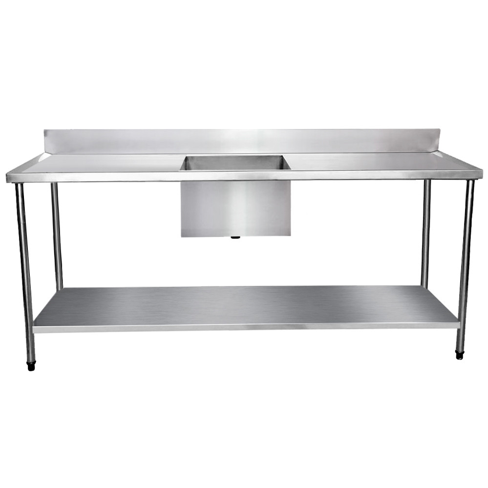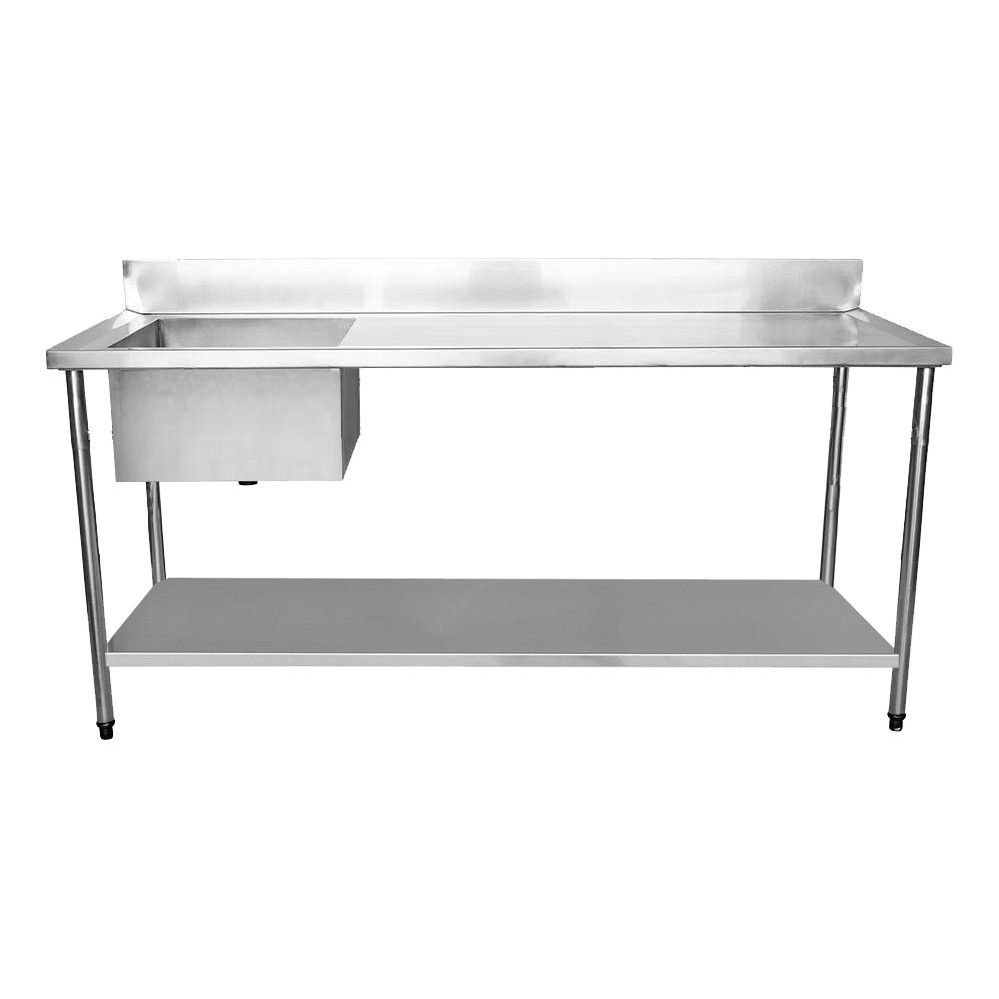 Mesa com 1,90 metros de comprimento com paneleiro produzida em Aço Inoxidável tipo 201 e com uma cuba 50x40x25cm produzida em Aço Inoxidável tipo 304. Suporta até 400kg de carga, sendo 300kg na tampa superior e 100kg na tampa inferior.