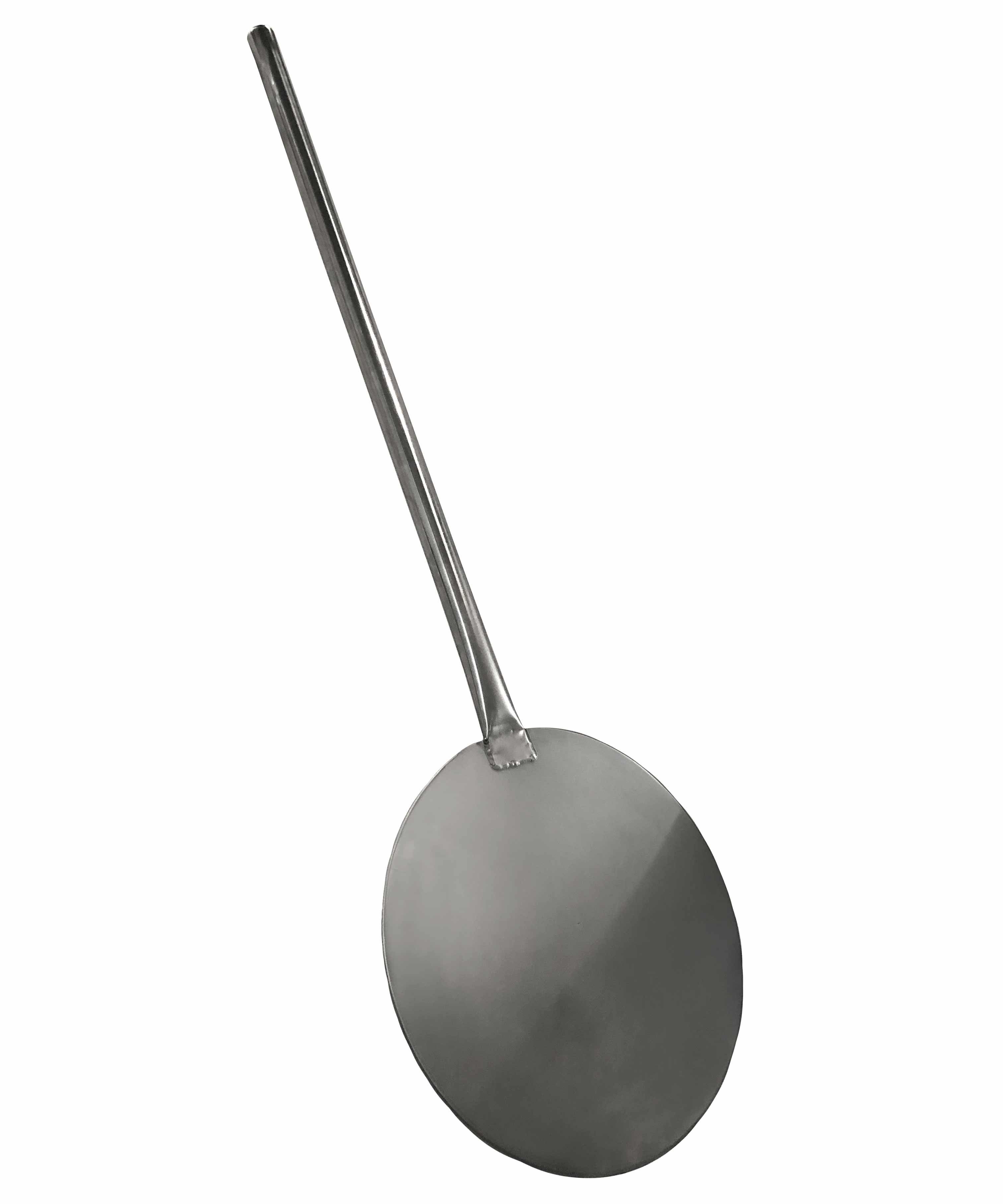 Pá de Aço Inox para manuseio de massas de pizza assadas em forno à lenha. Produto com comprimento de 1m de cabo e 45cm de diâmetro da sua base circular.