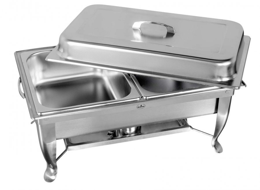 Alie elegância e praticidade para você servir seus alimentos em buffets e eventos com o Rechaud (Chaffing Dish) Retangular em Aço Inoxidável de 13 Lts com Pés Retráteis e 2 Cubas, versão TOP. Produto com um belo acabamento e ótima resistência.