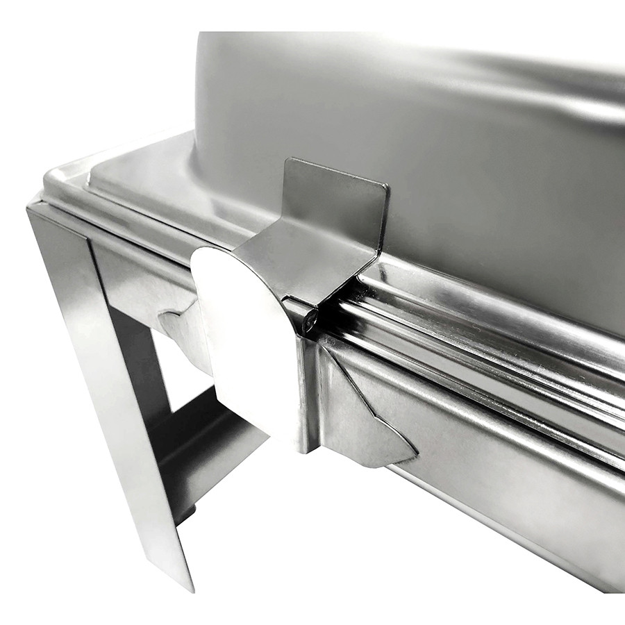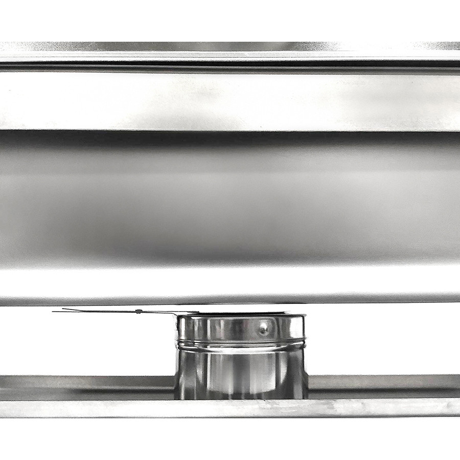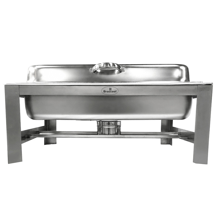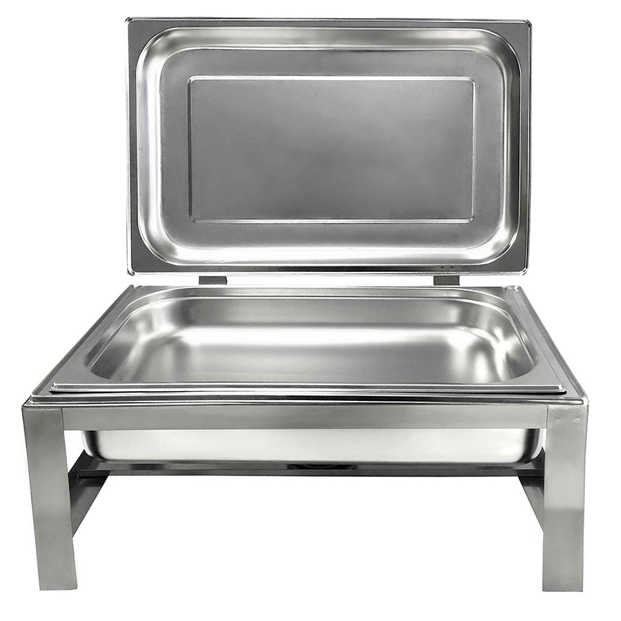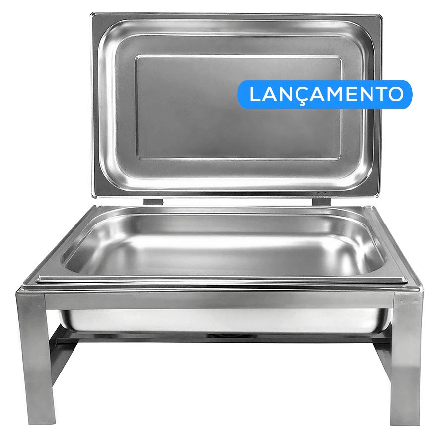 Rechaud Retangular com capacidade de 9 Litros, com 1 Cuba (GN 1/1 x 65mm) e Dobradiças na tampa. Perfeito para você servir seus alimentos com elegância e praticidade em refeitórios, buffets, eventos e até em sua residência.