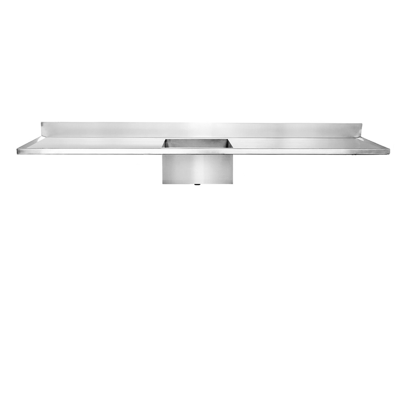 O Tampo Bancada possui, 2 metros de comprimento produzida no tipo 201, alta qualidade e resistência, com uma cuba Central, medindo 50x40x25cm de profundidade. Possui espelho de 10cm que possibilita o manuseio de líquidos, visando uma barreira entre o móvel e a parede, borda d'água e reforço na bancada.