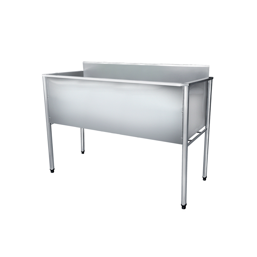 Tanque Pia de 1,50 metros de comprimento, totalmente produzido em Aço Inox 201. Com cuba de 142x51x45 cm e Espelho frontão de 10 cm, que tem por função a prevenção de respingos de água e demais líquidos na parede.